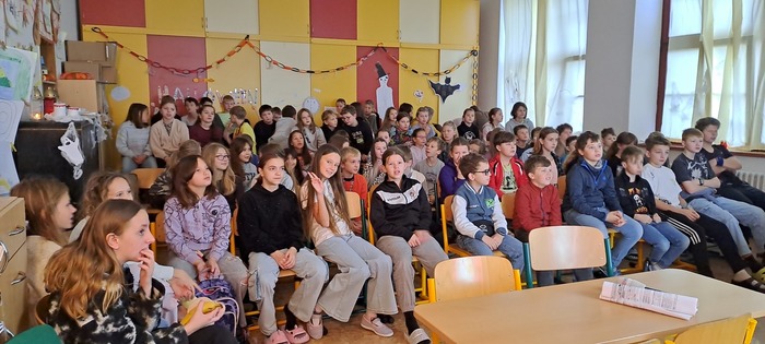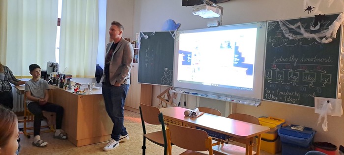 V naší krásně (trochu strašidelně) vyzdobené třídě jsme společně se žáky 4. třídy a 5. A přivítali Davida Pika - reportéra TV Nova. Přišel nám jakožto odborník z praxe popovídat o náplni jeho práce a přiblížit zákulisí televizních zpráv.