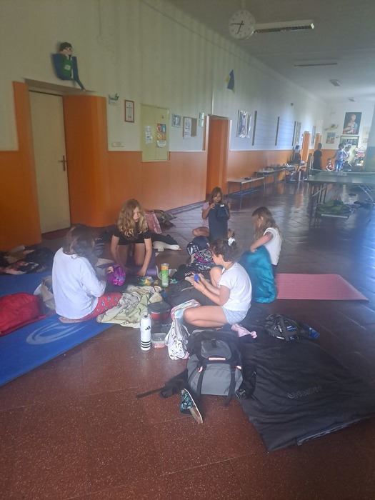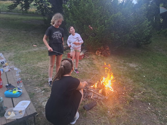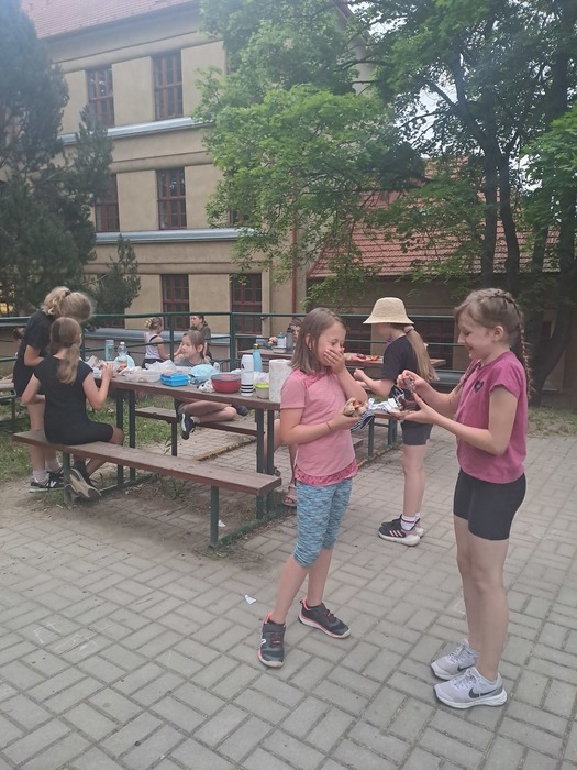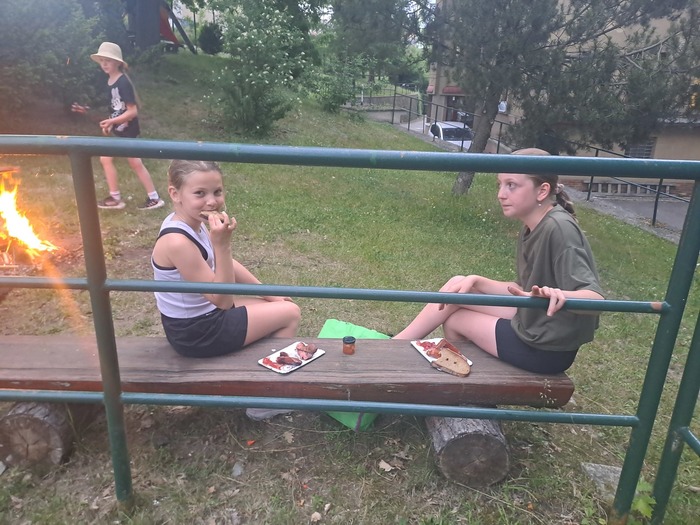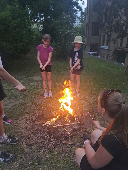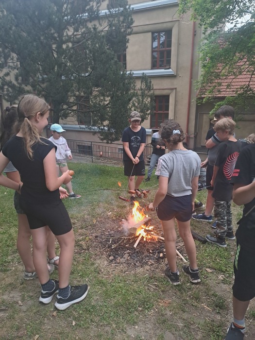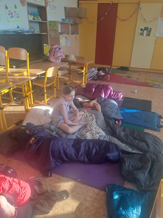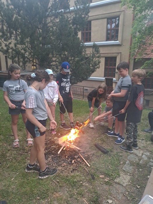 Hry na hřišti, opékání špekáčků, pořádný slejvák, společné hry, škola křížem krážem pozdě večer jen při svíčkách - trochu strašidelná, no a šup do spacáku - ve třídě nebo na chodbě ... toť přespávačka IV.B.