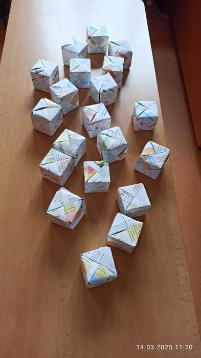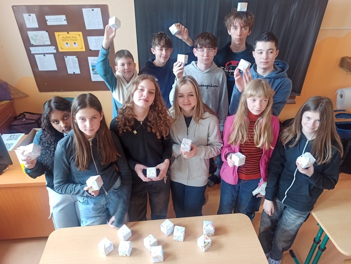 Na 1. stupni děti skládaly různé origami z papíru, připevnily na stuhy a vyvěsily na chodbu školy. Žáci druhého stupně skládali Sonobovu kostku. Lze ji vytvořit bez lepení z šesti čtverců. Vzniklé kostky jsme pospojovali tak, aby vznikly různé díly, z kterých lze složit velkou krychli.