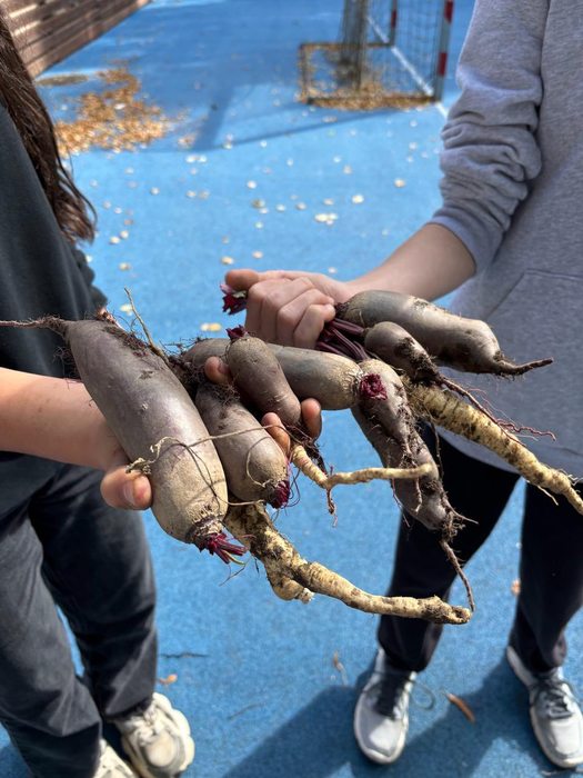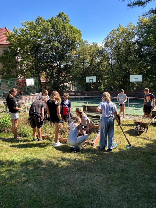 Naši šesťáci a sedmáci v akci. V rámci předmětu Pracovní činnosti - pozemky si sami zasadili brambory, hrách, mrkev, petržel, pastinák, cibuli, česnek, pažitku, ředkvičky, lichořeřišnici a květiny na sušení. Teď už si sklízí vlastní úrodu - a práce se opravdu vyplatila.
