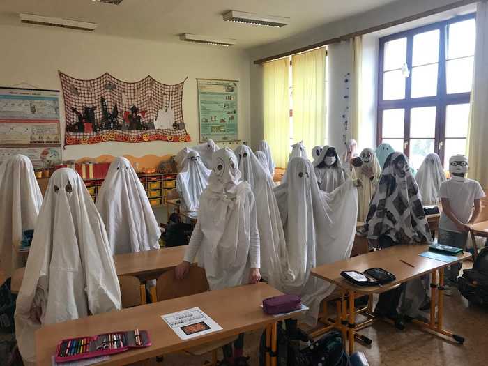 K dnešní akci žákovského parlamentu Halloween se připojili i mnozí učitele a učení mělo podtitulek Halloweenske učení. Například I.A dnes plnila halloweenské úkoly po celém patře