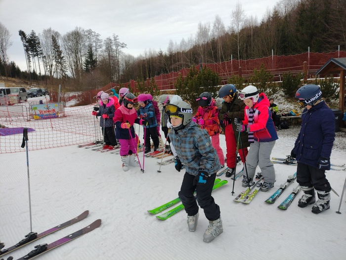 Dětí, které ještě nikdy nelyžovaly nebo už delší dobu na lyžích nestály, se ujali naši páni učitelé a paní učitelky. Společně začali s výukou u lyžařské školy. Nejdříve se děti něco dozvěděly o správném držení těla a pohybu na lyžích. Poté přešly k lyžování, kdy se učily správně plužit a brzdit. Když se naučily základy, mohly využít tažné lano a sjížděly mírný kopec. Každý den se podařilo několika dětem z této skupinky dostat se do skupiny lyžařů, kde už se opatrně pokoušely zvládnout i veliký kopec.