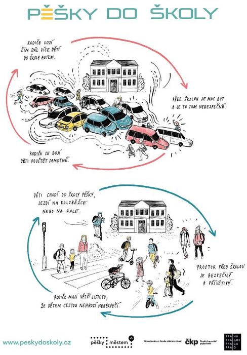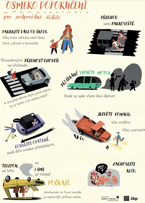 Chápeme, že pro mnohé z Vás je z různých důvodů cesta autem nezbytná. Zkuste tedy alespoň zaparkovat auto 5 až 10 minut od školy a nechte Vaše dítě dokončit cestu pěšky, nebo jej doprovoďte. Společná cesta je pro děti důležitá a může být navíc příjemná a zábavná.