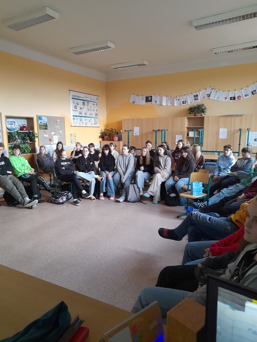 Letošním tématem byla touha lidí po svobodném životě a rovněž připomenutí si 55. výročí okupace Československa. V pátek 24. listopadu jsme uspořádali projekci filmu 1989: Z deníku Ivany A. Ivana byla v roce 1989 středoškolačka, psala si deník a v něm zachytila poslední rok existence Československa. Film představil skutečné deníkové záznamy, ukázky z dobového zpravodajství i soukromé dokumenty a fotografie. Naším hostem se letos stal pan Petr Palovčík, který před Listopadem 1989 žil v Brně a často se dostával do střetů s tehdejším režimem, protože s kamarády poslouchal „závadnou“ hudbu, nekonformně se oblékal a česal či se účastnil nepovolených akcí. Jeho vyprávění o životě mladých lidí v 80. letech a o listopadových událostech 1989 naslouchali žáci 9. ročníku velmi pozorně. Na závěr besedy zodpověděl jejich dotazy a také si poslechl vzpomínky, které žáci získali od svých rodičů či prarodičů.