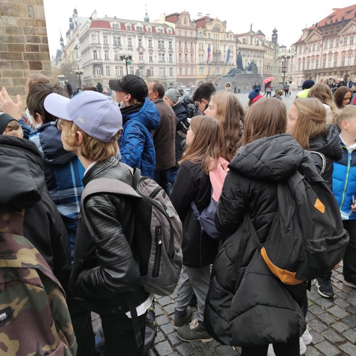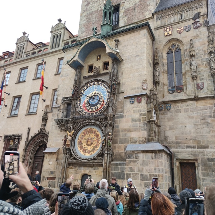 Při zpáteční cestě na autobus jsme stihli Pražský orloj na Staroměstské radnici zobrazující při odbíjení celé hodiny dvanáct apoštolů, představení ukončil kohout svým zakokrháním.