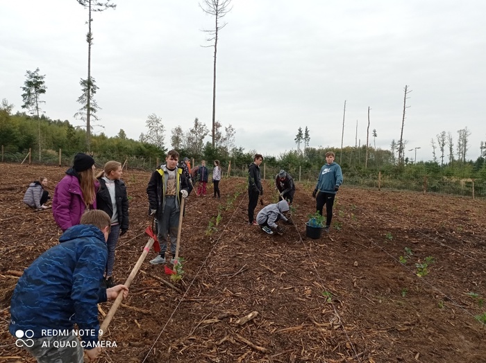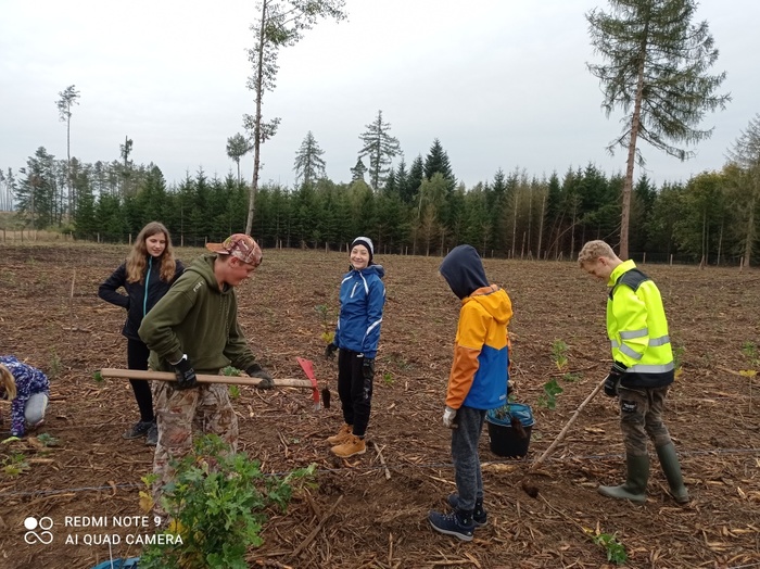 Ve čtvrtek 7. 10. 2021 se žáci 7. a 9. ročníku zapojili do celosvětového projektu Nadace Kronospan, který si dává za cíl pomoci s obnovou lesního porostu v našem okolí, a to v souladu s hlavní myšlenkou projektu "Pojďme budoucnost sázet spolu".