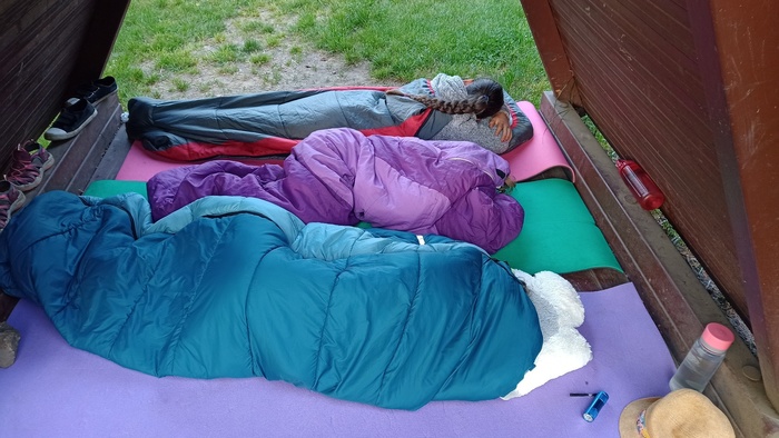 Děti, které tento školní rok navštěvovaly badatelský klub na naší škole, si před začátkem druhého pololetí vymýšlely, co by chtěly zkoumat, pozorovat či zažít. Většinu jejich přání se nám podařilo zrealizovat – psaní tajným písmem, tvoření krystalů, svět pod mikroskopem, bádání ve školní zahradě, či pozorování života na mokřadech. Děti si také přály někam vyrazit i přes noc, a tak nás napadlo, proč nevyužít naši školní zahradu? Terén kolem školy nám moc neumožňuje postavit stany, proto jsme vyklidili družinovou chatičku s malou verandou a dřevěný přístřešek. Sešli jsme se navečer, společně rozdělali oheň, opekli si něco dobrého – nechyběly buřty, jablka, rohlíky či brambory. Každý si pak připravil na vybrané místo karimatku a spacák s polštářkem. I přes rušivé zvuky ze silnice a houkání projíždějících vlaků se nám podařilo usnout a ráno nás probudil příjemný zpěv ptáčků a hřejivé paprsky sluníčka. Budeme mít na co vzpomínat!