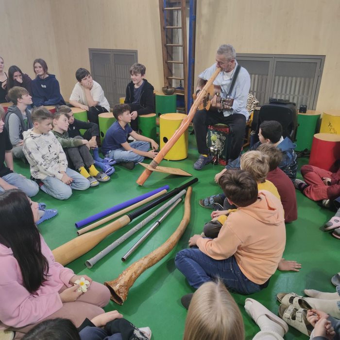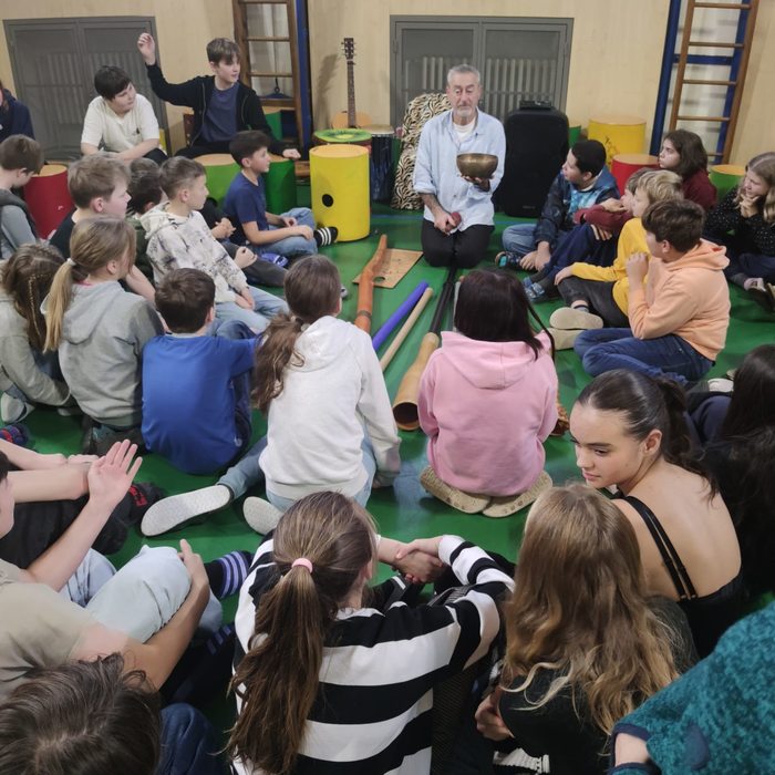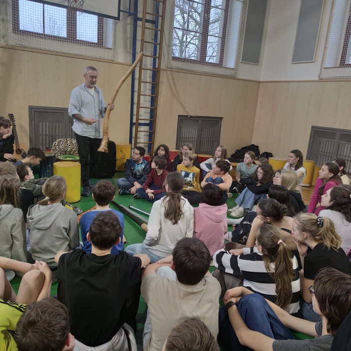 Ve čtvrtek 4. prosince 2025 se uskutečnil pro všechny žáky naší školy (byli rozděleni do pěti skupin) výchovný koncert = společné bubnování. Ze Znojma za námi přijel Zdeněk Roller, který vyvíjí a používá originální rytmickou techniku.