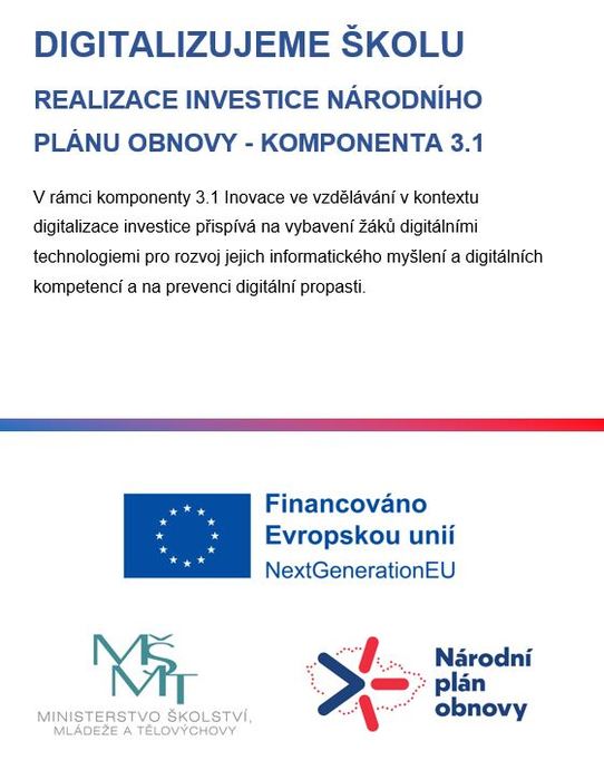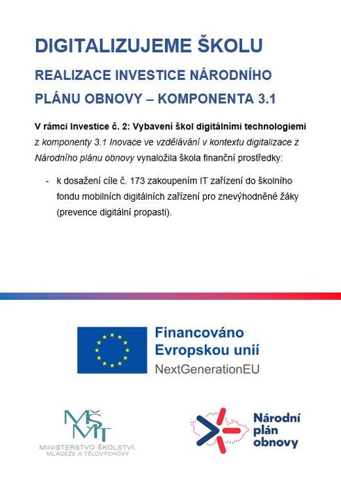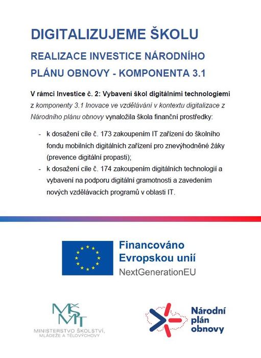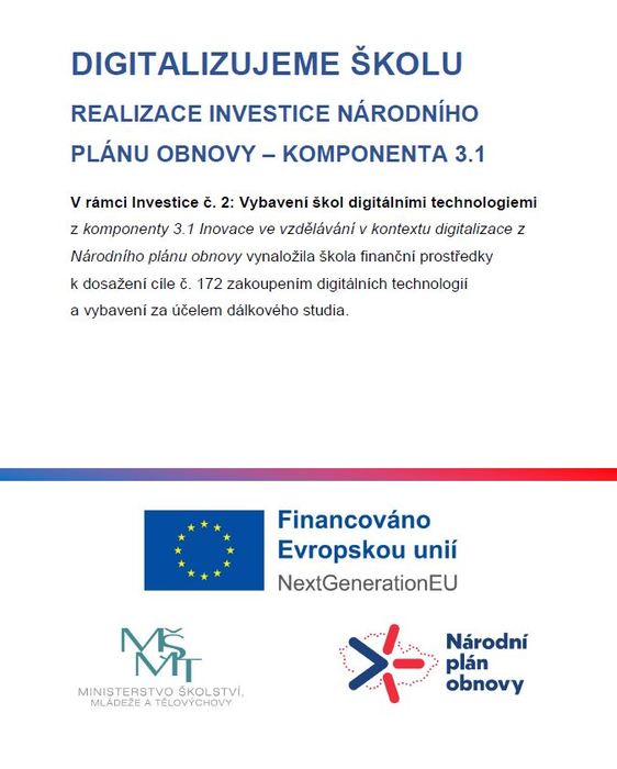 V rámci Investice č. 2: Vybavení škol digitálními technologiemi z komponenty 3.1 Inovace ve vzdělávání v kontextu digitalizace z Národního plánu obnovy vynaložila škola finanční prostředky: