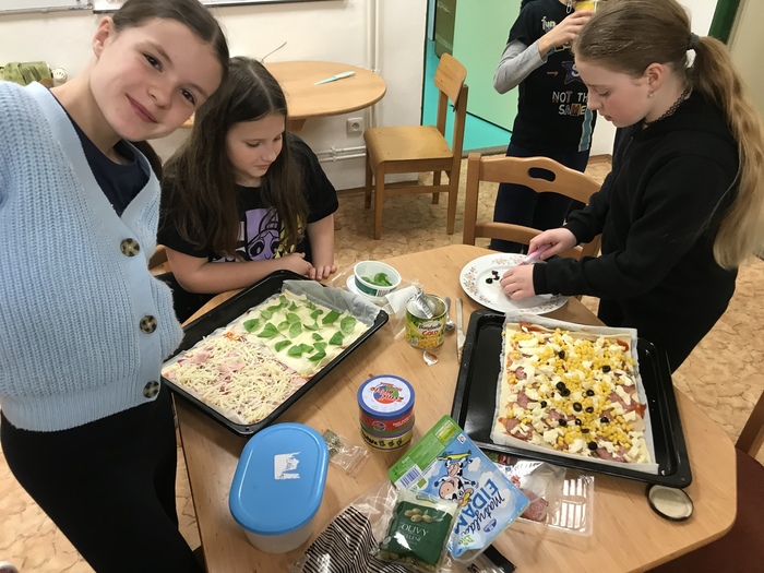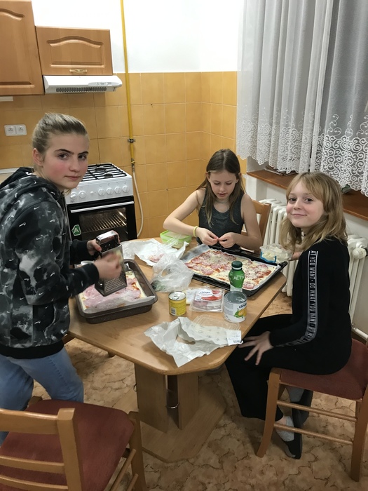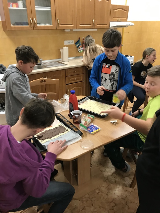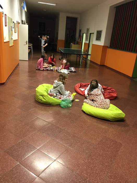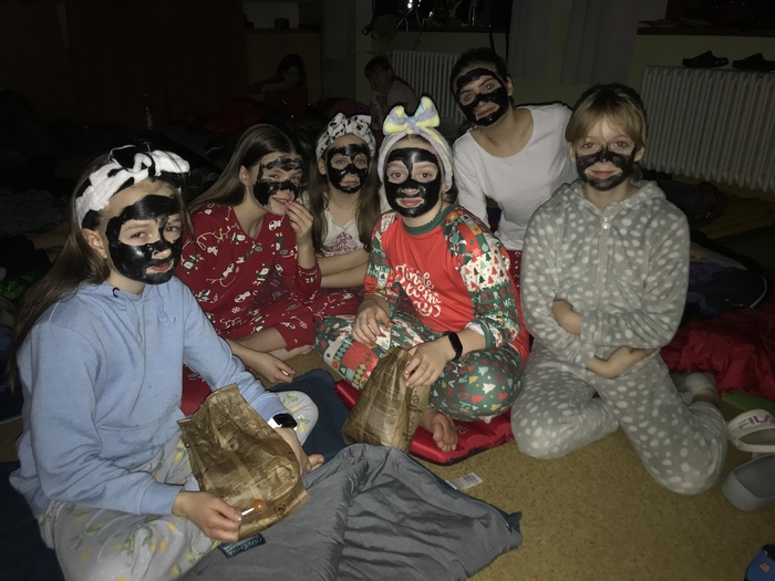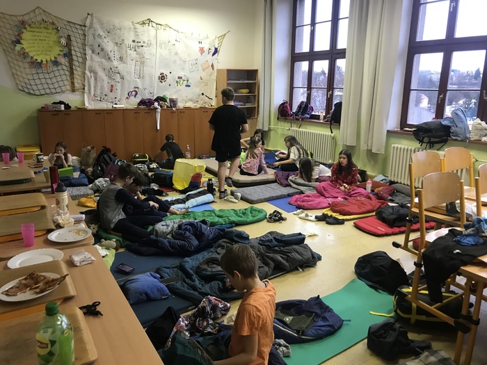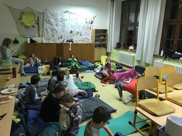 Ze čtvrtka na pátek jsme spali ve škole. Sešli jsme se v 18h před školou. Šli jsme si udělat pizzy k večeři. Ustlali jsme si ve třídě, hráli jsme hry, koukali na film a před spaním si udělali menší stezku odvahy. Ráno jsme si po úklidu třídy dali malou procházku. :)