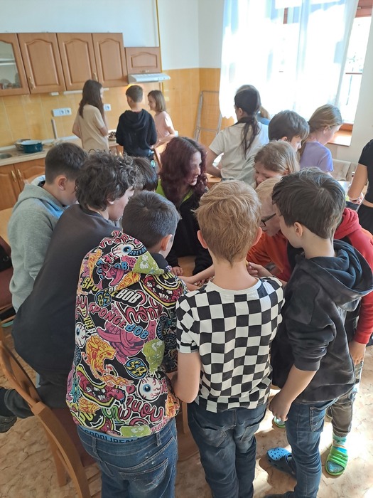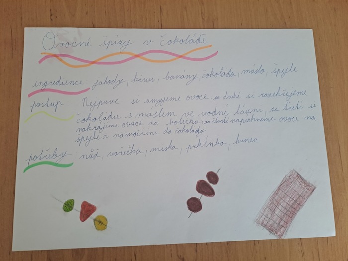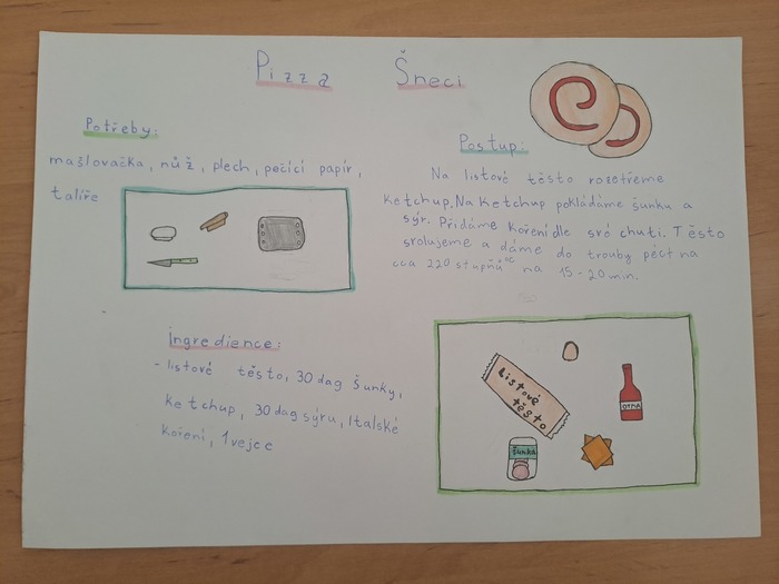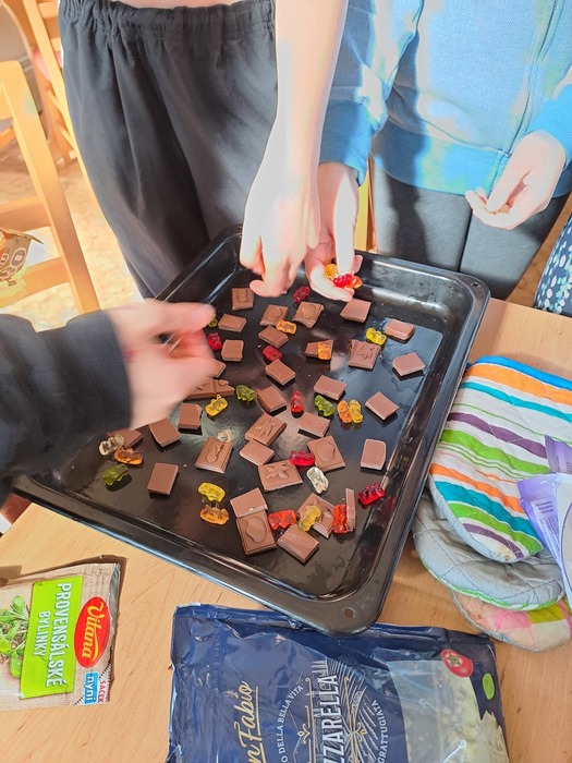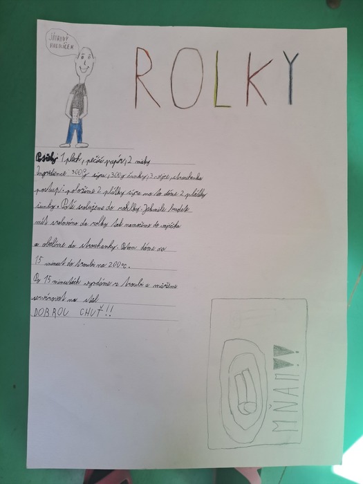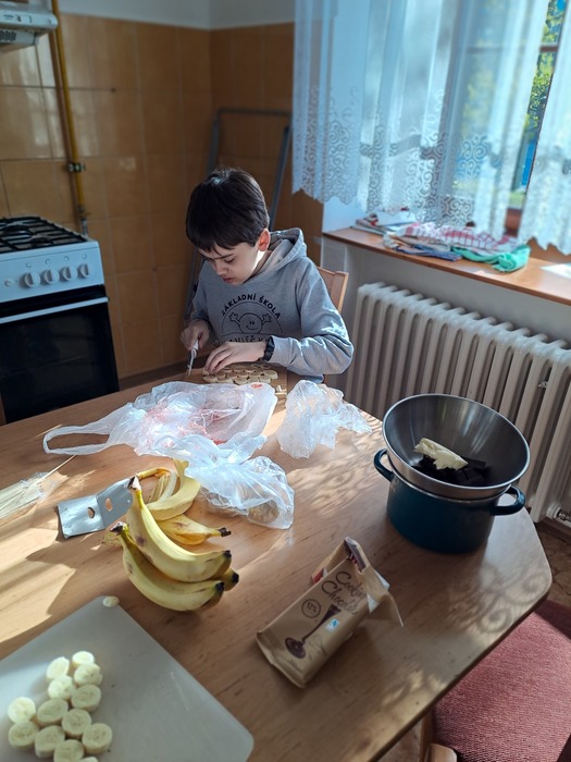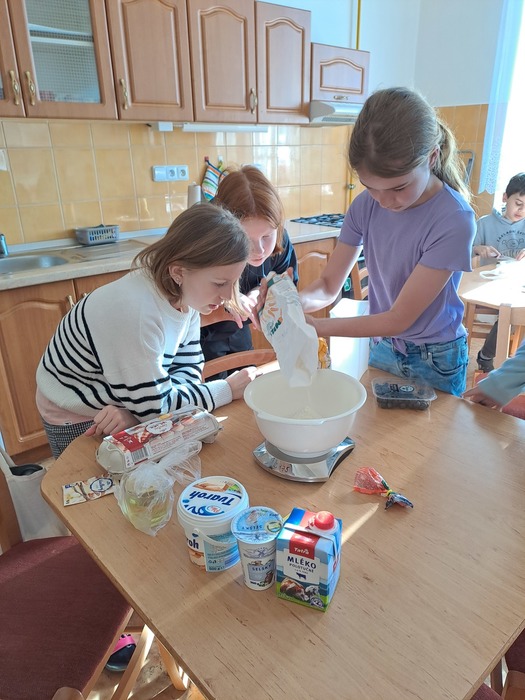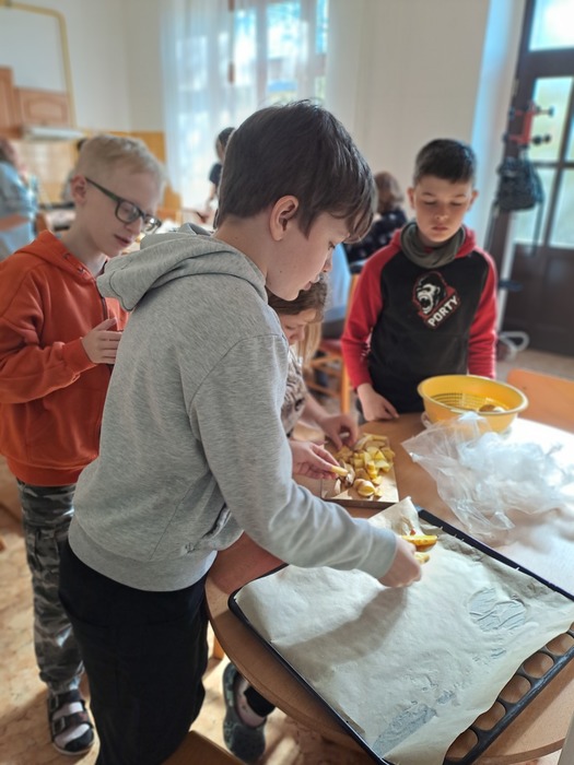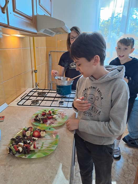 Kromě toho, že momentálně trénujeme pravopis přídavných jmen, sčítání a odčítání desetinných čísel, upevňujeme si své znalosti o České republice nebo se snažíme proniknout do fungování lidského těla, snažíme se rozvíjet i praktické dovednosti. Ve třídě se děti rozdělily do skupinek, domluvily se na pokrmu, který zvládnou společnými silami uvařit nebo upéct, zjistily si recept, všechny potřebné ingredience a ceny surovin, které budou potřebovat. Dále měly za úkol domluvit se, kdo které suroviny a další ingredience nakoupí nebo přinese, aby to bylo pro všechny přibližně stejně finančně náročné. Děti vše v kuchyňce v rámci svých skupinek zvládly na výbornou. Dokonce donesly ochutnat své menu i panu řediteli nebo paní zástupkyni. Posledním krokem byl úklid celé kuchyňky. To někoho ale vůbec nebavilo! No a před obědem nám zbyl ještě čas trochu se venku proběhnout.