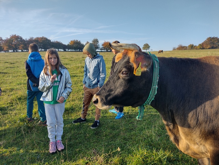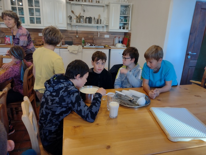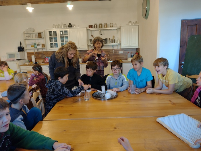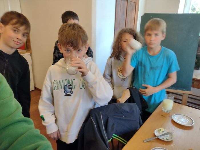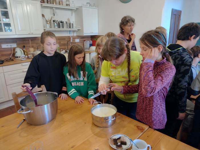 Potom jsme se přesunuli zpět do bývalé školy, kde se děti vrhly na výrobu sýru, který si mohly odvézt domů. Během výroby děti měly možnost ochutnat nejenom čerstvé kravské mléko, ale i smetanu, podmáslí a syrovátku. Od paní lektorky dostaly ještě kousek chleba, na který si namazaly vlastnoručně ušlehané máslo.