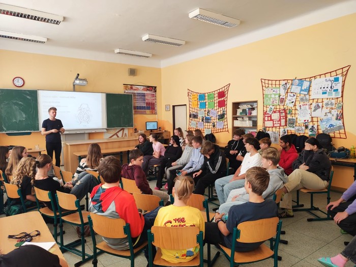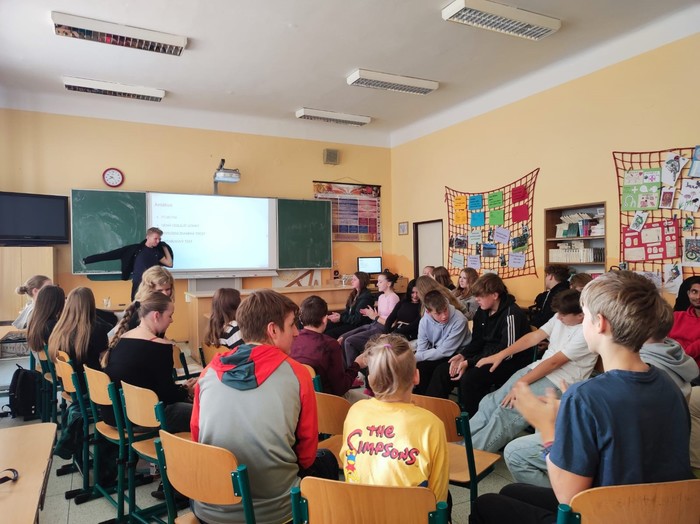 V pondělí 14. 10. nás navštívil Petr Harazin. Jak sám o sobě říká, před třemi lety mu pobyt v Psychiatrické nemocnici v Opavě otevřel oči a svůj příběh sdílí veřejně dál. Snaží se v besedě studentům pomocí svých osobních zkušeností ukázat, že alkohol je nebezpečná droga, která dokáže normálního člověka poslat na dno.