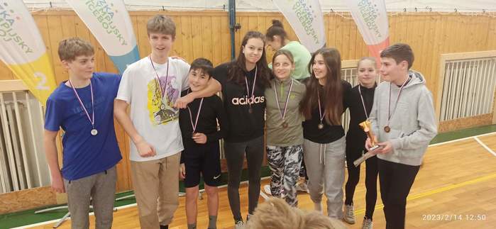 Zástupci naší třídy se v únoru účastnili sportovní akce na ZŠ Rošického. Soutěžili proti družstvům z jiných škol v přeskoku přes švihadlo či driblingu mezi kuželi. Dalšími soutěžními disciplínami byly kliky, hod medicinbalem a trojskok. Jejich snaha byla oceněna bronzovou medailí.